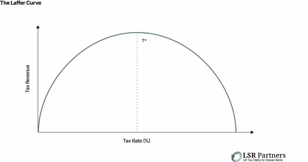 Plot tax rates on the X-axis and total revenue on the Y-axis and you get a curve: revenue rises with rates up to a peak, then falls as rates keep climbing. That’s the Laffer Curve. The debate isn’t about whether the curve exists, it’s about where the UK is on it right now for different taxes.